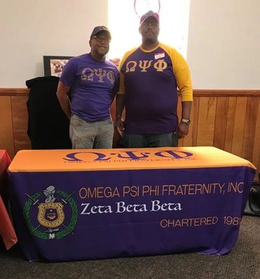 Bros. Tracy Boles and Marki Dixon display customized table cloth presented to Zeta Beta Beta by the Fall 2017 MSP Brothers.